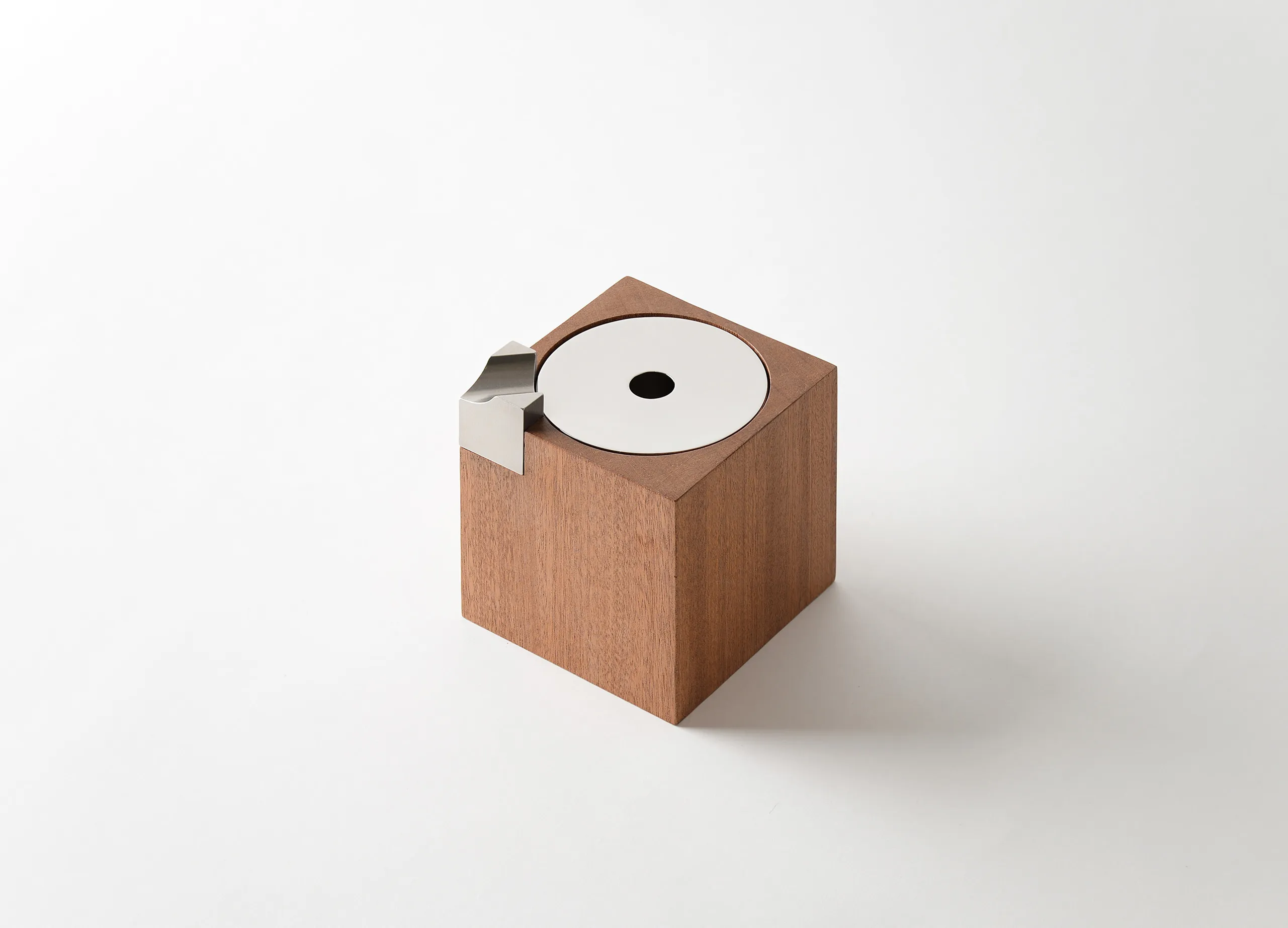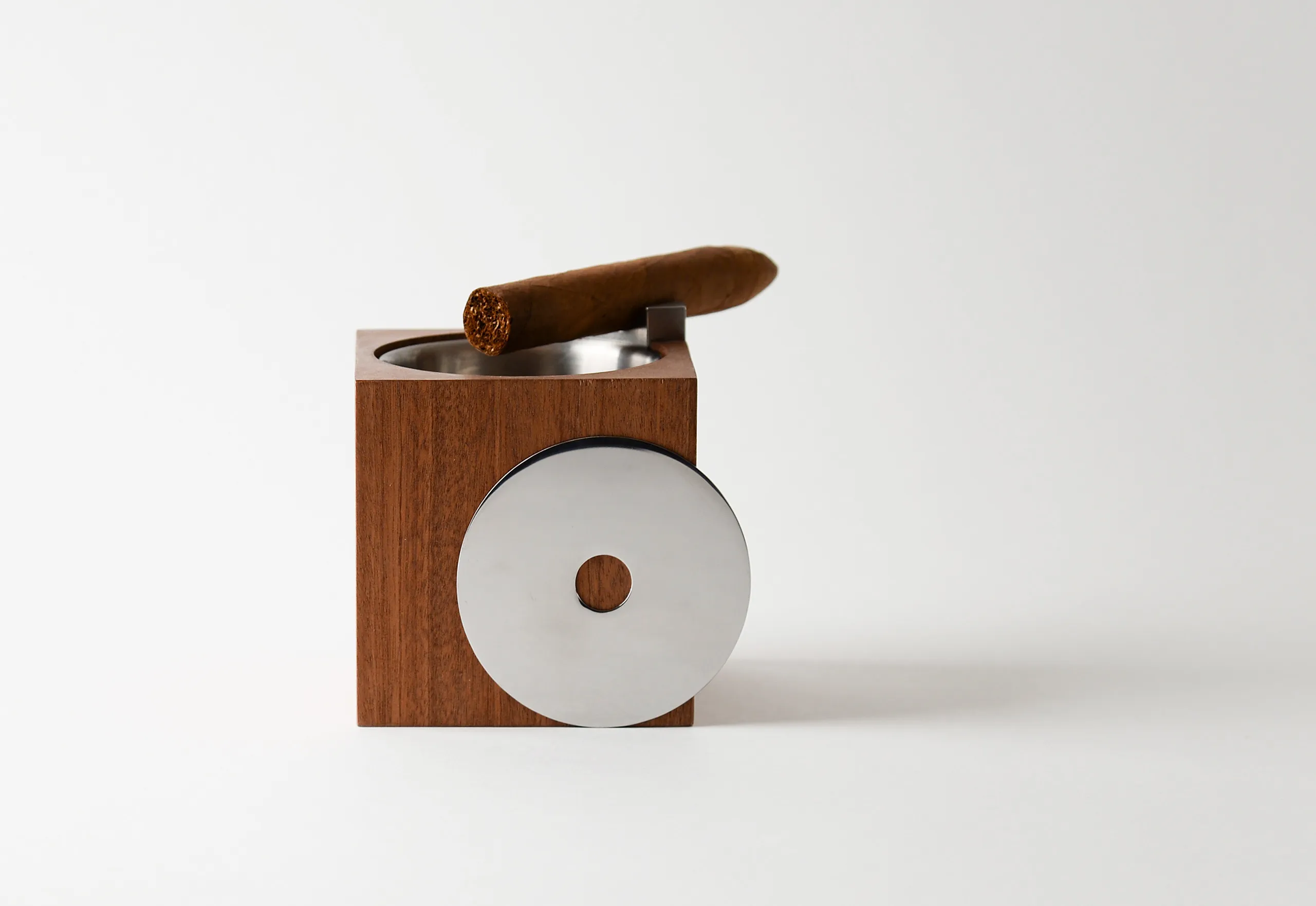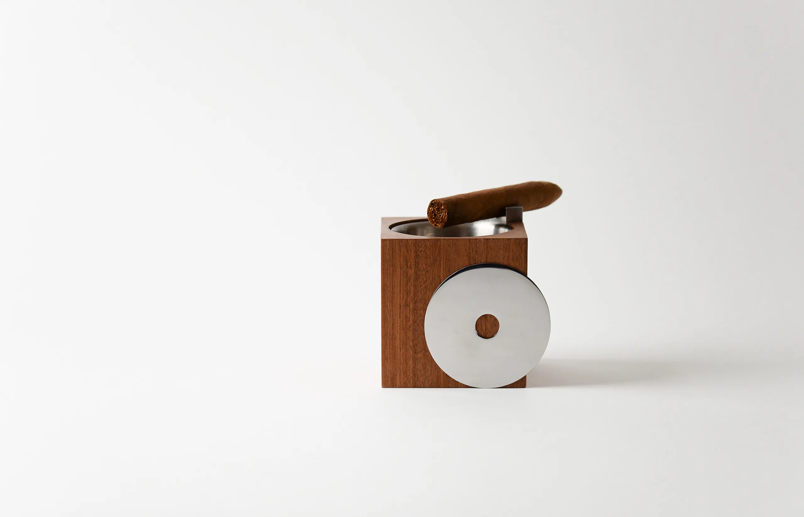 A solid stainless steel cube is inset into a corner of the Sapele chassis. Elevated above the timber surface, its top features a diagonal semi-circular groove—a resting point for a cigar. This intersection of wood and steel establishes a sense of visual and physical weight.