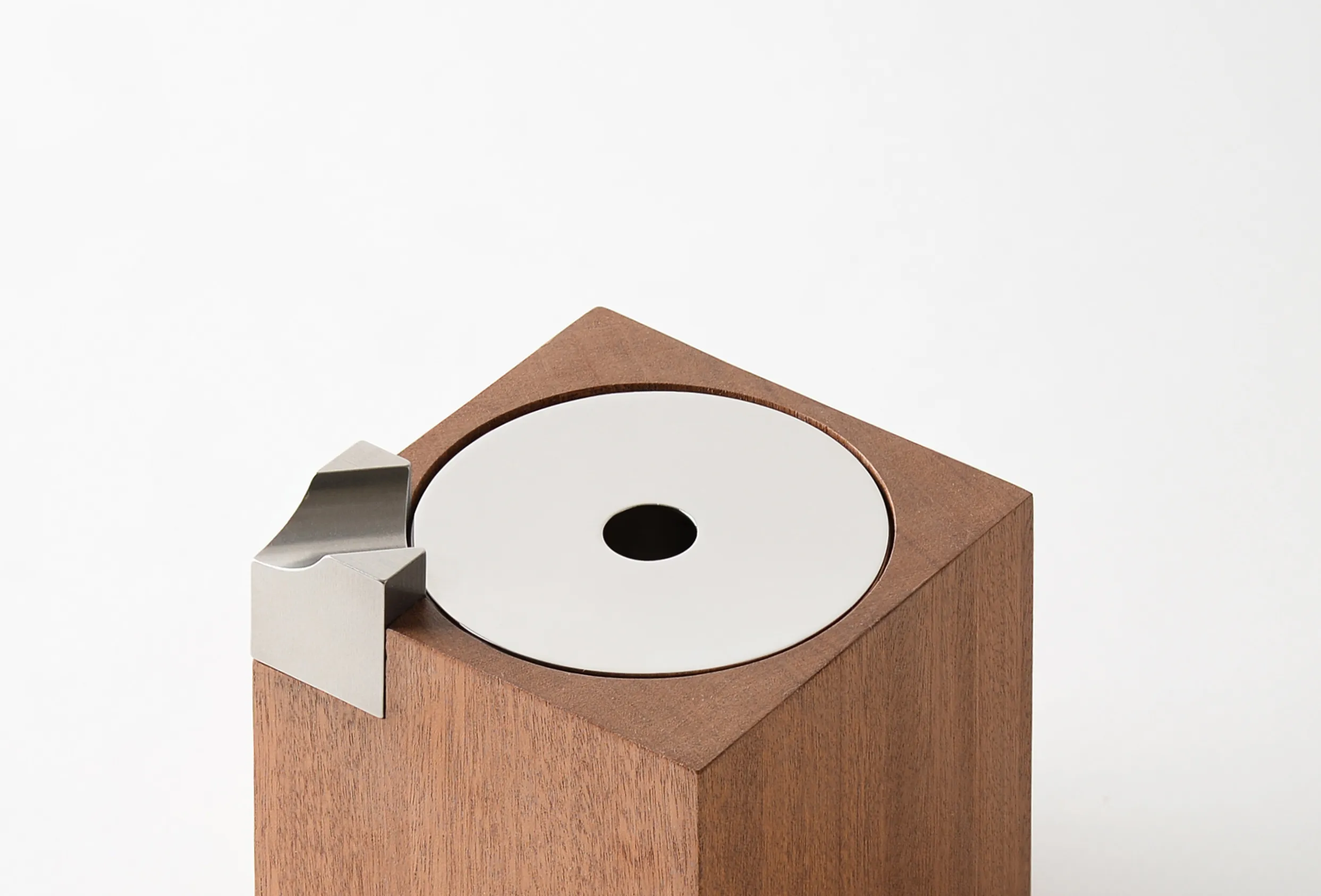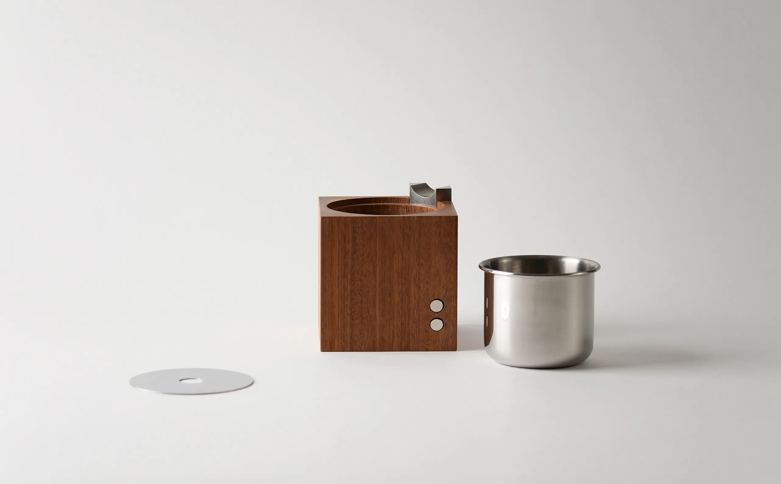A martensitic stainless steel disc serves as a lid. An aperture provides a finger-access point for removal. The disc is designed to be magnetically docked to the side of the timber block when not in use, held in place by a dual-magnet structure.